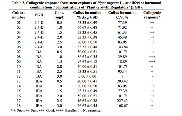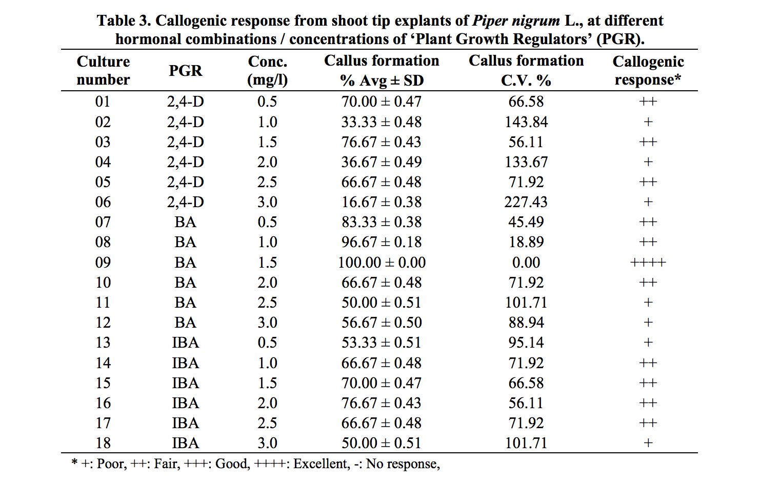- Ảnh hưởng của các nồng độ 2,4-D khác nhau đối với sự sinh trưởng của tế bào: Đối với sự hình thành mô sẹo in vitro từ lá, thân và đỉnh chồi được lấy từ cây hồ tiêu trưởng thành. Murashige & Skoog Medium (1962) được bổ sung với nồng độ 2,4-D khác nhau, dao động từ 0,5 mg/l đến 3,0 mg/l. Sự hình thành mô sẹo từ mô lá là thấp (+) với nồng độ 0,5, 1,0 và 1,5 mg/l 2,4-D. Trong khi ở nồng độ cao hơn 2,0, 2,5 và 3,0 mg/l cho thấy sự sinh trưởng tế bào được đáp ứng thuận lợi (++). Những mẫu mô ở thân cho sự hình thành mô sẹo kém (+) trên nồng độ 1,0 và 3,0 mg/l, trong khi đó phần còn lại phát triển thuận lợi (++) ở nồng độ 2,4-D 0,5, 1,5, 2,0 và 2,5 mg/l . Mẫu mô đỉnh chồi cho số lượng nhỏ mô sẹo với nồng độ 2, 4-D là 1,0, 2,0 và 3,0 mg/l. Trong khi 0,5, 1,5 và 2,5 mg/l cho thấy đáp ứng sự sinh trưởng tế bào thuận lợi (++). Tuy nhiên, 2,4-D đã không sản xuất số lượng mô sẹo phù hợp ở hầu hết tất cả các nồng độ và các mẫu mô thử nghiệm. Các mô sẹo được hình thành là cứng, không chảy, trắng nâu và không tạo phôi (Bảng & hình 1, 2 và 3).