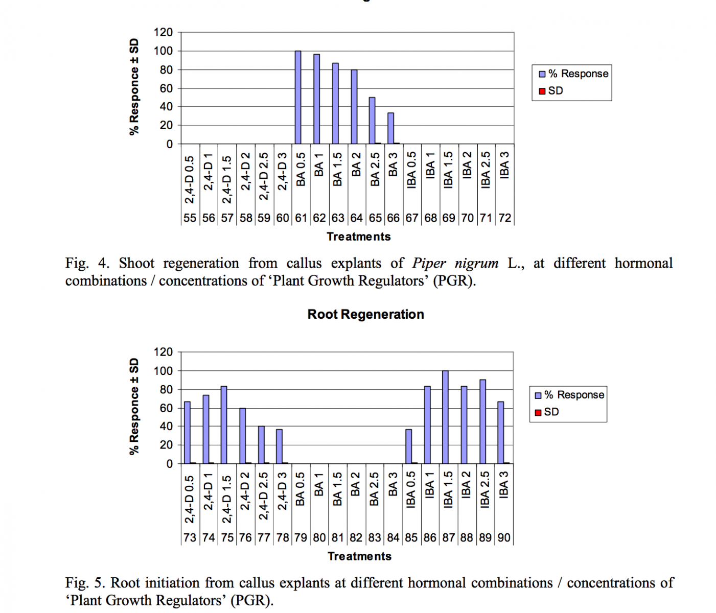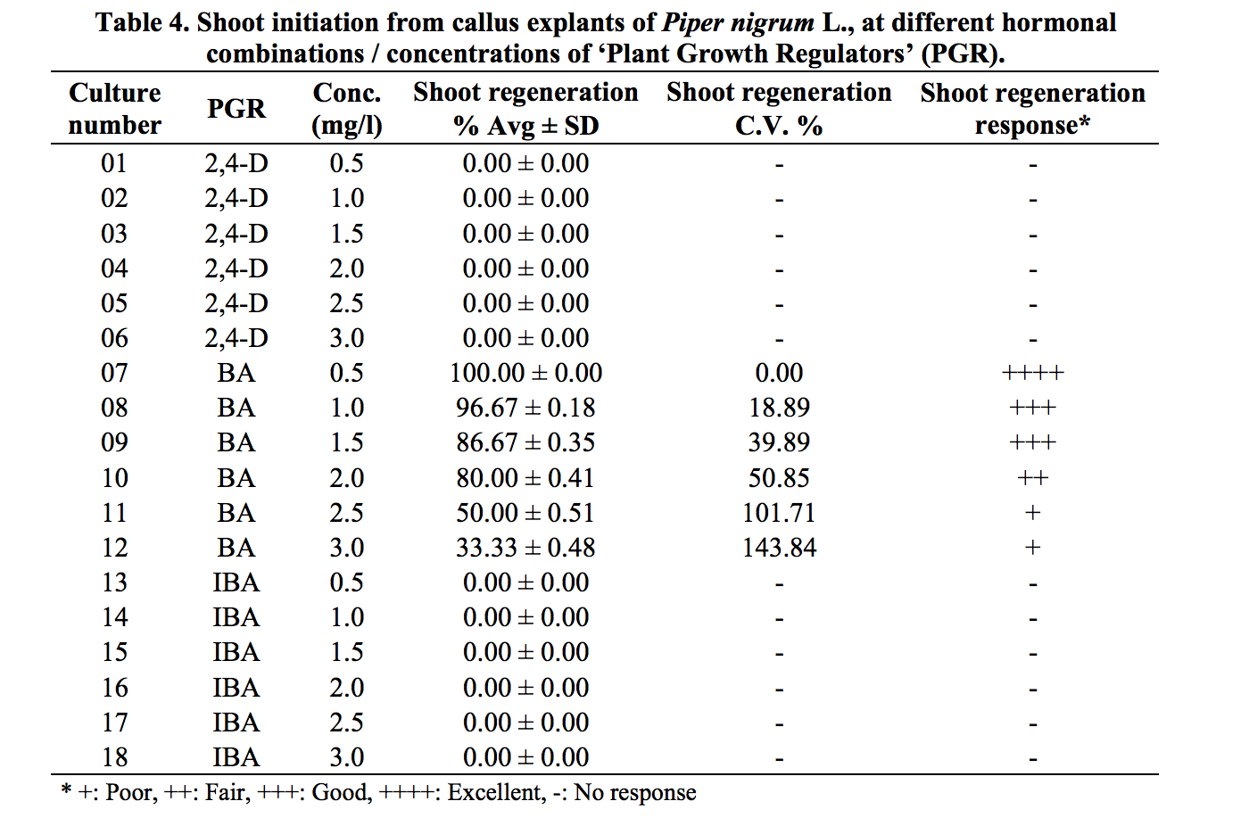 - Trong nghiên cứu hiện tại, các chất điều chỉnh tăng trưởng khác nhau (Auxions và Cytokinins) đã được thử nghiệm cho sự sinh trưởng của cây hồ tiêu từ lá, thân và đỉnh chồi và sự hình thành bộ phận từ mô sẹo để tạo ra cây không bệnh của Piper nigrum L. Nhiều kỹ thuật nuôi cấy in vitro thành công cho vi nhân giống Hồ tiêu đã được báo cáo bằng cách sử dụng mô ở đỉnh chồi (Nazeem et al., 1992, Philip và cộng sự, 1992, Babu và cộng sự, 1993, Joseph et al., 1996, Philip và cộng sự, 1992), mô lá (Sujatha và cộng sự., 2003), mô nút (Bhat và cộng sự., 1992), mô rễ Bhat và cộng sự., 1995) và từ các hạt giống (Nair & Gupta, 2006). Các cây non được tái sinh từ mô sẹo của những cây trồng bằng hạt và chồi cây cũng đã được báo cáo, nhưng hầu hết các nỗ lực để tái tạo cây trồng từ cây trưởng thành không thành công (Mathews & Rao, 1984). Kết quả của nghiên cứu này đã chứng minh rõ ràng sự tái sinh của cây con từ cây hồ tiêu trưởng thành thông qua nuôi cấy mô. Tác dụng của các hooc môn khác nhau đối với sự sinh trưởng và sự hình thành bộ phận được mô tả như sau: