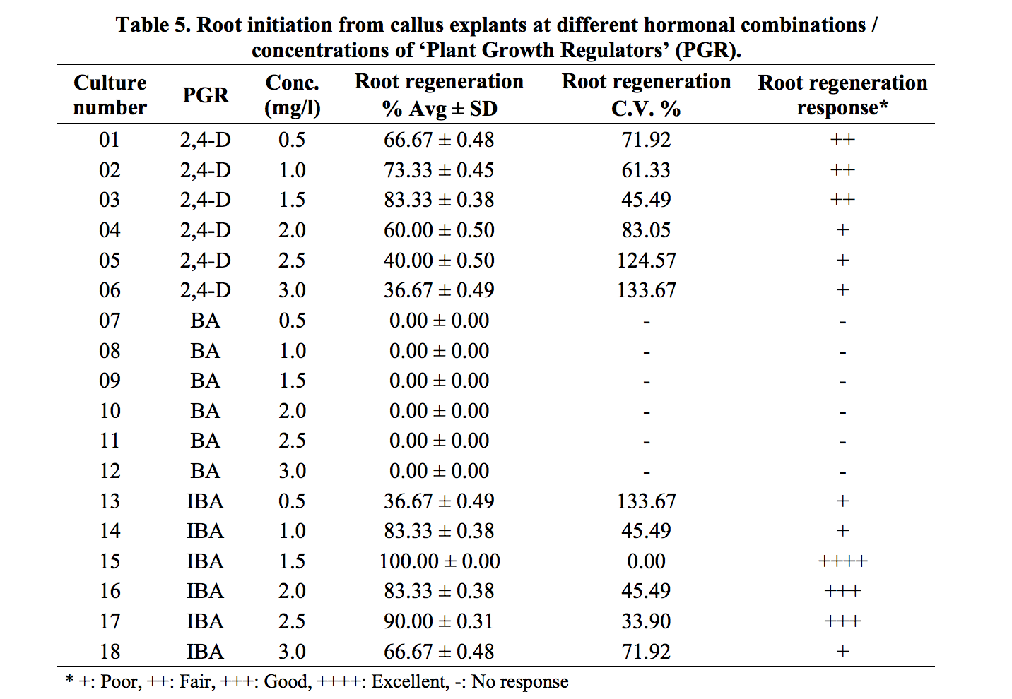 Các nồng độ khác nhau của BA (cytokinin) dao động từ 0,5-3,0 mg/l trong môi trường MS không hình thành rễ (-) từ những chồi tái sinh bởi vì quá trình hình thành, phát triển và kéo dài của rễ In vitro thường đòi hỏi môi trường có chứa Auxin (Azad và cộng sự, 2003).