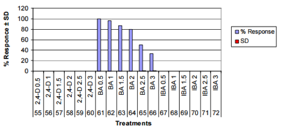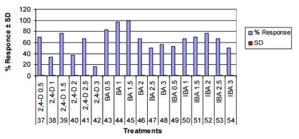 Ở nồng độ IBA 1,5 mg/l trong môi trường MS ở tất cả các nền văn hoá ra rễ rất tốt (++++) trong vòng 8 ngày (Bảng và hình 5). Trái ngược với kết quả của chúng tôi, Bhat (1995); Azad (2003) đã sử dụng IAA 1μM để kích thích ra rễ từ các chồi tái sinh.