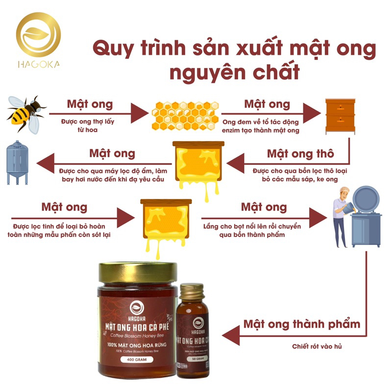 - Mật ong hoa cà phê Hagoka là loại mật ong nguyên chất nhất, bởi vào lúc mùa hoa cà phê nở rộ đã đi vào lời bài hát “Tháng 3 mùa con ong đi lấy mật” là mùa mà những chú ong chăm chỉ bay đi hút mật khắp quanh các cây cà phê, hút phấn hoa cà phê và cho ra những giọt mật ong hoa cà phê thuần khiết vị thơm ngon sánh mịn .