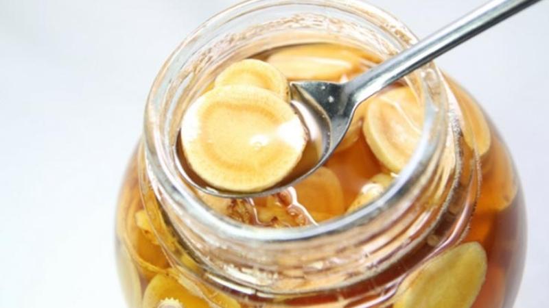 - Cách khác bạn dùng thìa lấy khoảng 2-3 lát sâm ngâm mật ong rồi pha với 200ml nước ấm. Khuấy đều tay cho tan hết mật ong là có thể sử dụng. Sâm Ngọc Linh bạn cũng tiến hành nhai kỹ và nuốt như bình thường.